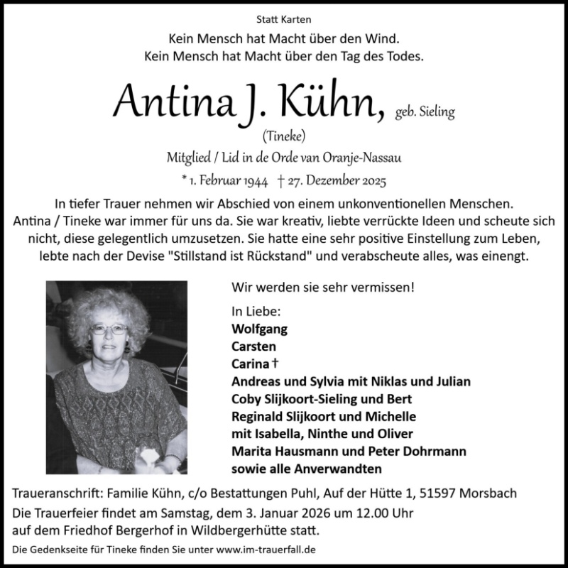 Bei der Trauerfeier habe ich noch mal hören dürfen, was für ein bewegtes Leben sie hatte. Ihrem Motto: Stillstand ist Rückstand, hat sie alle Ehre gemacht. Leider habe ich nicht mehr erfahren, wodurch Antina Mitglied in de Orde van Oranje-Nassau geworden ist. Ich würde mich sehr freuen, das irgendwann noch zu erfahren.