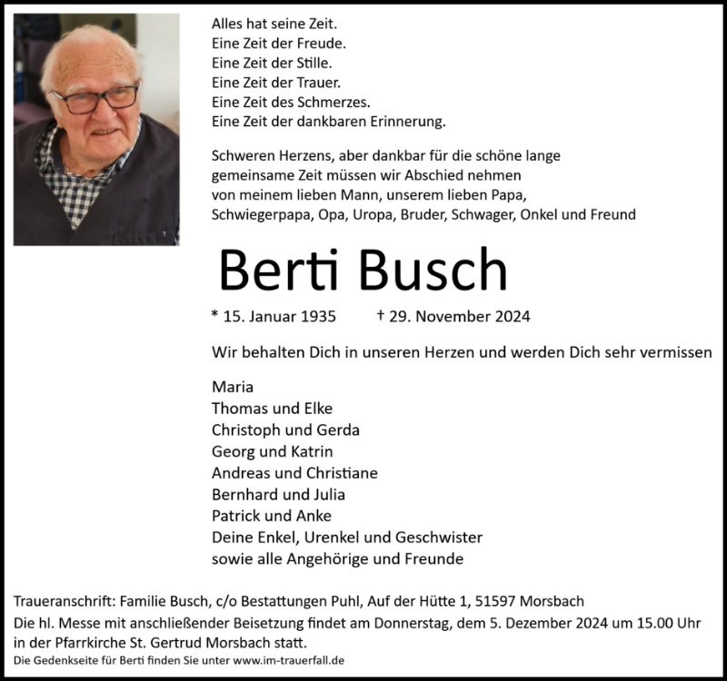 meine aufrichtige Anteilnahme gilt Ihnen, Frau Busch und der ganzen Familie. Ich wünsche Ihnen viel Kraft in dieser schweren Zeit.