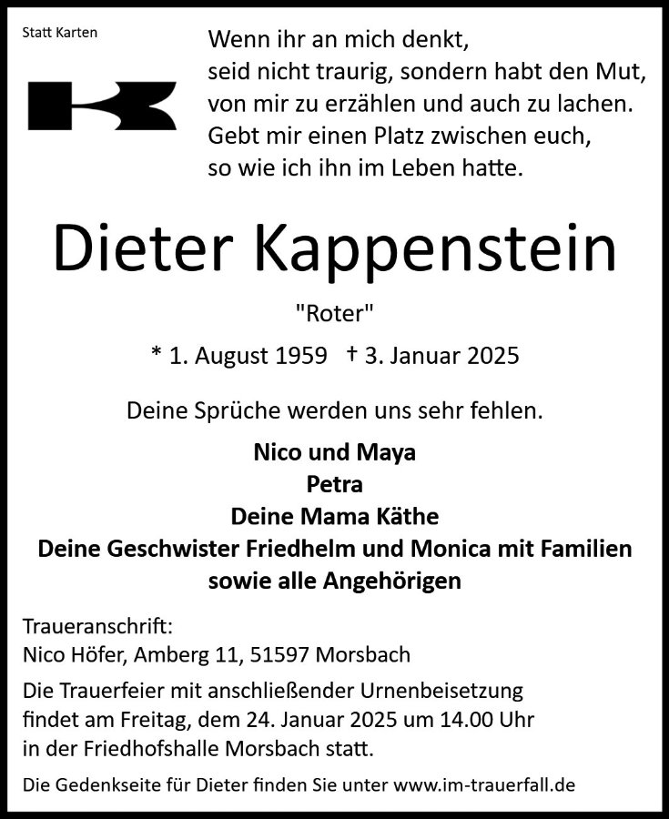 Ich schau auf WhatsApp und kann es immer noch nicht fassen, am 03.12.24 hast Du mir noch eine Nachricht nach Kenia gesendet und Dich nach Flüge erkundigt. Jetzt bist Du nicht mehr da, es kam so schell, viel zu früh und unerwartet aber in meinen Gedanken wirst Du immer einen Platz haben. Wir haben viel erlebt zusammen und hatten Spaß ohne Ende, vor allem in den 80 ern. Leider können Conny und ich Dich nicht auf Deinem letzten Weg begleiten, da wir immer noch in Kenia verweilen. Ruhe in Frieden mein Freund, wir sehen uns wieder.