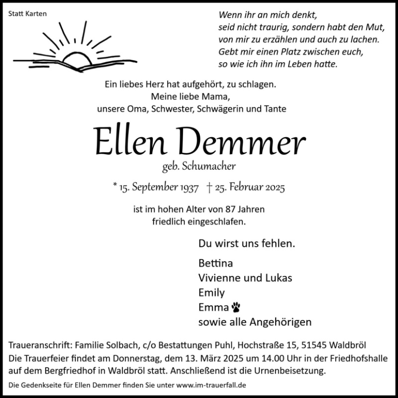 „Schaut nicht voller Trauer auf mein Fortgehen…schließt eure Augen und ihr werdet mich unter euch sehen, jetzt und immer“