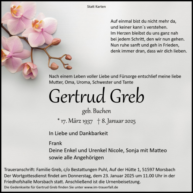 Mit großem Bedauern habe ich vom Tod von Frau Greb erfahren.