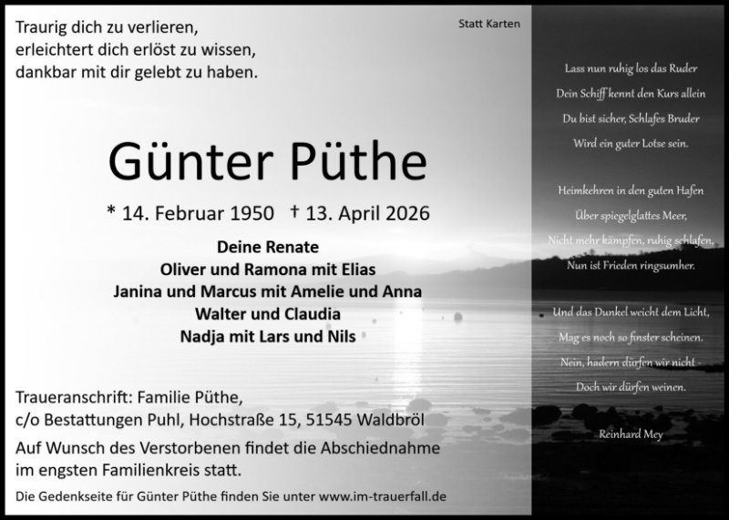Wir wünschen euch viel Kraft, Zusammenhalt und viele schöne Erinnerungen an Günther, die euch Trost spenden.