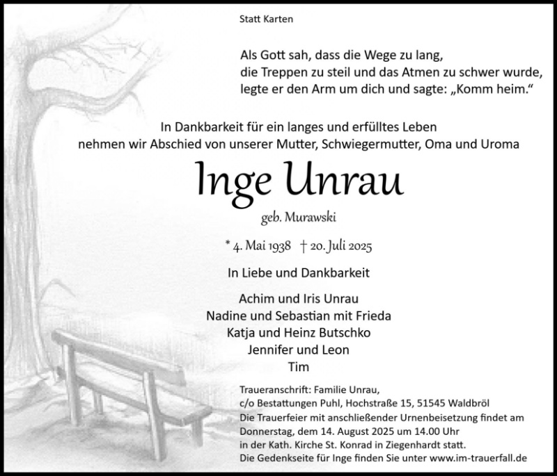 wir wünschen Ihnen für die kommende Zeit viel Kraft und dass es Ihnen gelingt, dankbar auf die positiven Erinnerungen zurückzublicken. Diese Gedenkseite möge Ihnen dabei helfen, Ihre Trauer zu teilen und das Andenken gemeinsam wachzuhalten.