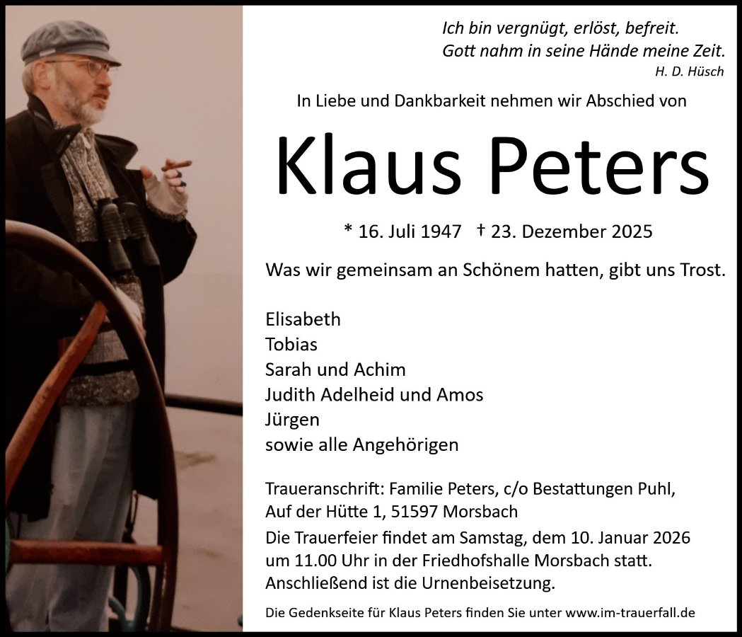 Unsere Familie nimmt dankend Abschied von Herr Peters, da er unsern Vater das Rauchen verboten hat in dem im sagte: "wenn Sie so weiter machen, sehe ich Sie am Ende des Jahres nicht". Das ist 21 Jahre her. Diese Geschichte wird von unseren Kindern noch weiter Erzählt, somit wird Herr Peter für uns lange am weiter leben sein.