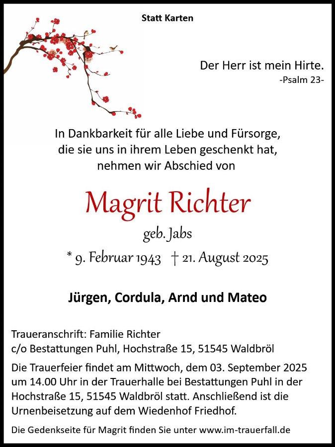 mit großer Anteilnahme habe ich vom Tod Ihrer Frau, Mutter und Großmutter erfahren. Frau Richter war ein Mensch voller Wärme, Herzlichkeit und Stärke. Ihr aufrichtiges Interesse an uns und ihre liebevolle Art haben viele von uns tief bewegt.