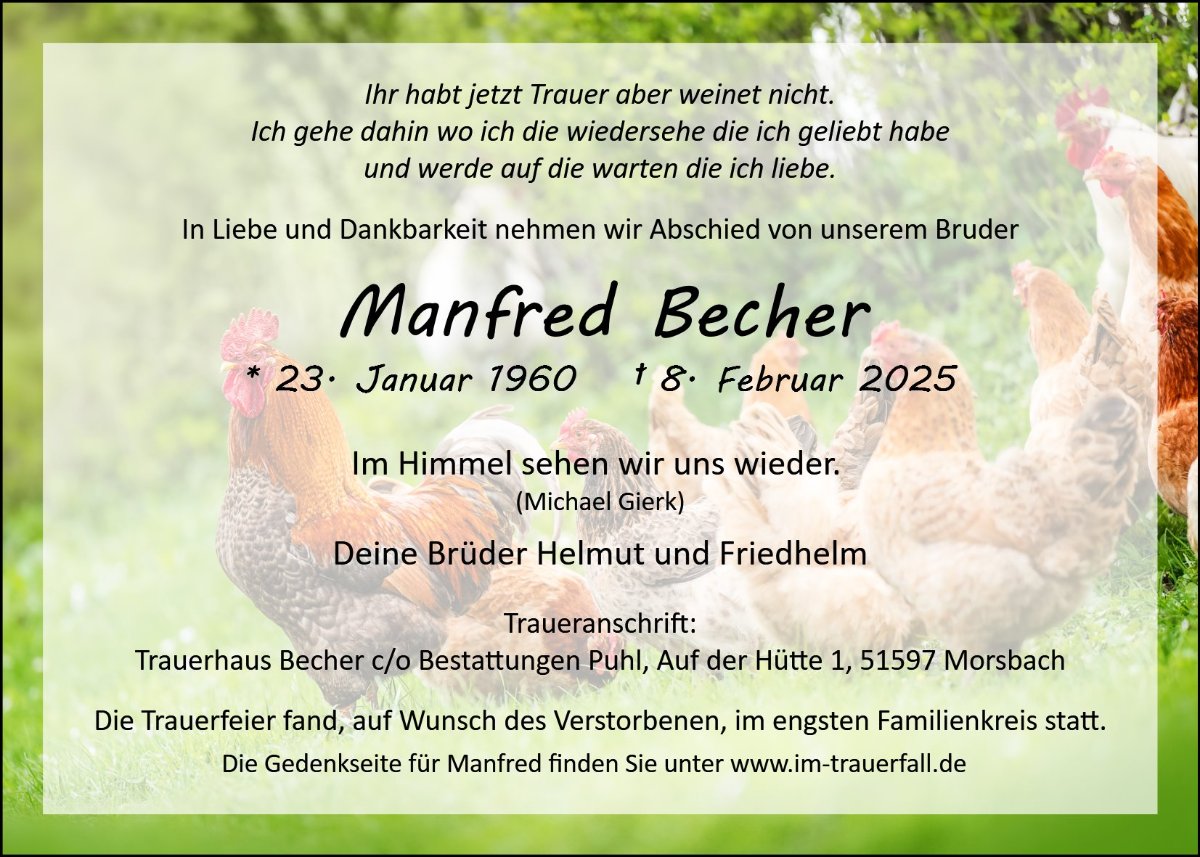Lieber Manni, es tut mir sehr leid, daß du so früh von uns gehen musstest. Du warst mir in Wiehl ein lieber, netter und freundlicher Kollege. Meine Anteilnahme gilt auch deinen Brüdern.